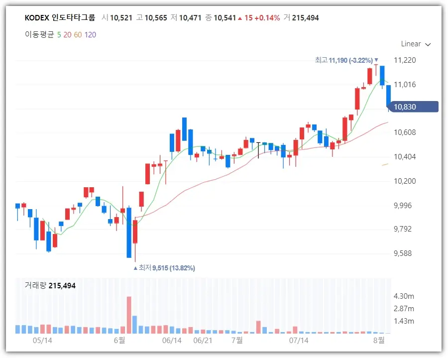 | TIGER 인도니프티50 | 2023년 4월 14일 | 미래에셋 | 약 89억 | 5,124억 | 니프티50 인덱스 |
