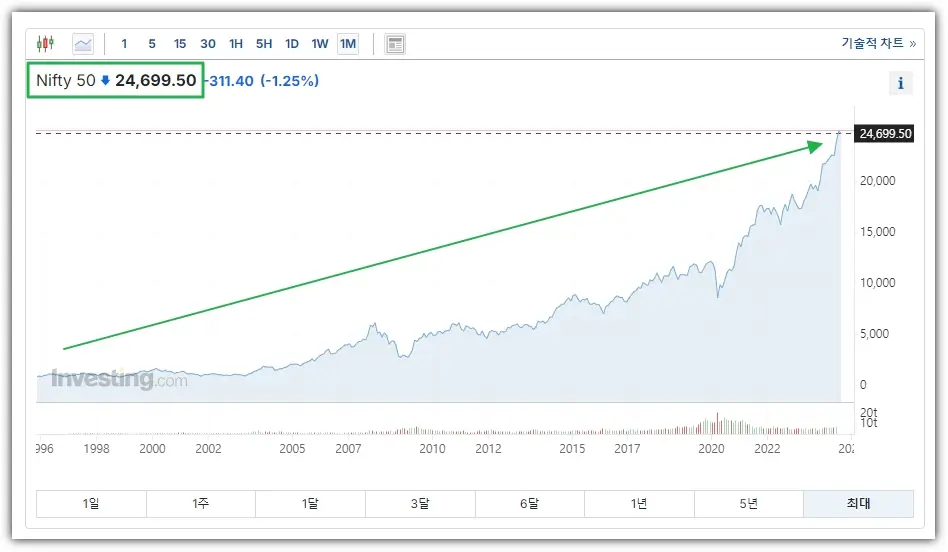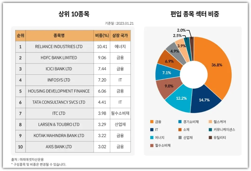 Nifty 50 인덱스는 인도의 대표적인 주가 지수입니다. 위 5개 종목이 니프티50 지수를 추종하고 있는데요. 인도 내셔널 스탁 익스체인지(NSE)에 상장된 상위 50개 기업의 주가를 반영하고 있지요. 쉽게 말해, 인도 경제의 건강 상태를 보여주는 중요한 지표라고 할 수 있습니다.