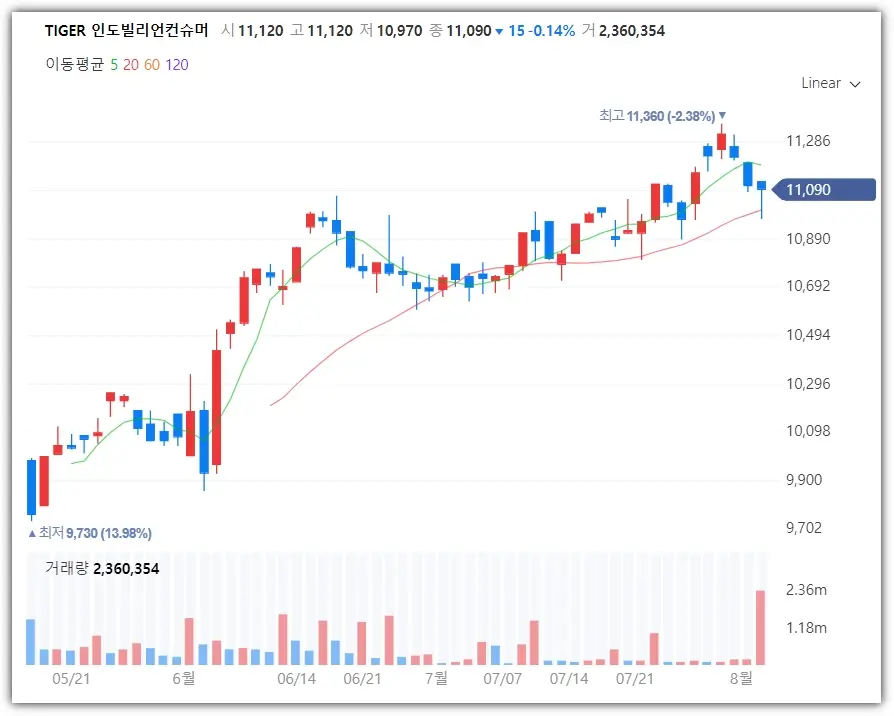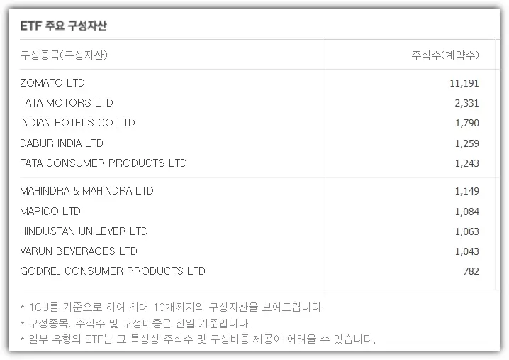 위와 같은 기업들로 구성되어 있고, 자유소비재와 필수소비재가 적절하게 포진되어 있다는 게 특징입니다. 인도의 인구가 워낙 많고, 중산층의 성장으로 소비재 시장도 활성화되고 있는만큼 해당 종목에 대한 관심도 높아지고 있습니다.