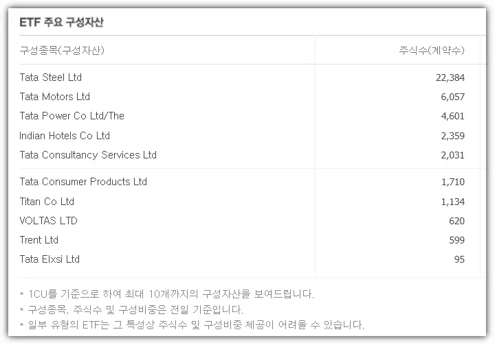 KODEX 인도타타그룹 ETF는 인도의 대표적인 대기업 그룹인 ‘타타그룹’에 집중 투자하는 ETF입니다. 타타그룹은 자동차, 이커머스, 인프라, IT, 원자재, 금융, 리테일, 여행 등 다양한 산업에 계열사를 거느리고 있습니다. 우리나라의 삼성과 많이 비교가 되며, 인도 증시에서 타타그룹이 차지하는 비중은 8%로 상당히 높은 편입니다. 변동성이 크지만 그만큼 높은 성장 가능성을 가진 ETF입니다. 운용보수는 0.49%로 비교적 낮지만, 기타 비용과 매매 중개 수수료가 아직 확인되지 않기 때문에 이 부분은 좀 더 기다려봐야 합니다.