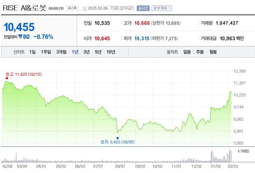 RISE AI&로봇 ETF가 6개월 수익률 54.93%를 기록하며 3위를 차지했습니다. 그러나 1년 수익률은 -3.04%인데요. 2023년 10월 24일 상장 이후, 급격히 올랐던 가격이 계속 하락하면서 8월 6,420원을 최저가를 찍고, 다시 상승하는 중입니다.