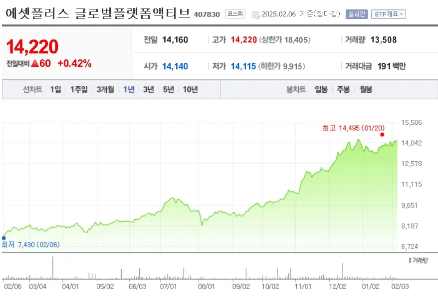 ETF는 주식처럼 가격이 움직이기 때문에 너무 급등한 상태에서 사면 리스크가 커질 수 있습니다. 따라서, 최근 6개월 ~ 1년 차트를 확인하고 가격이 너무 급등한 상태인지 체크합니다. 52주 최고가에 근접한 경우, 조정 가능성이 있습니다.