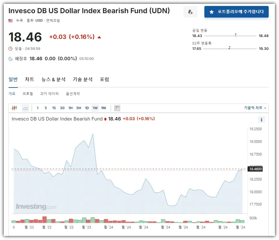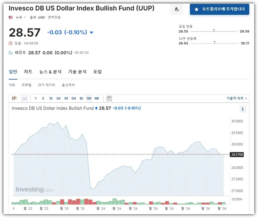 인베스코에서 운영하고 있는 ETF입니다. DXY 지수를 반대로 추종하는 상품인데요. 이 ETF는 미국 달러가 주요 세계 통화 대비 약세를 보일 때 수익을 얻도록 설계되었습니다. 달러의 가치 하락에 베팅하는 상품입니다. 달러가 약세일 때 수익을 기대하는 투자자에게 적합합니다.