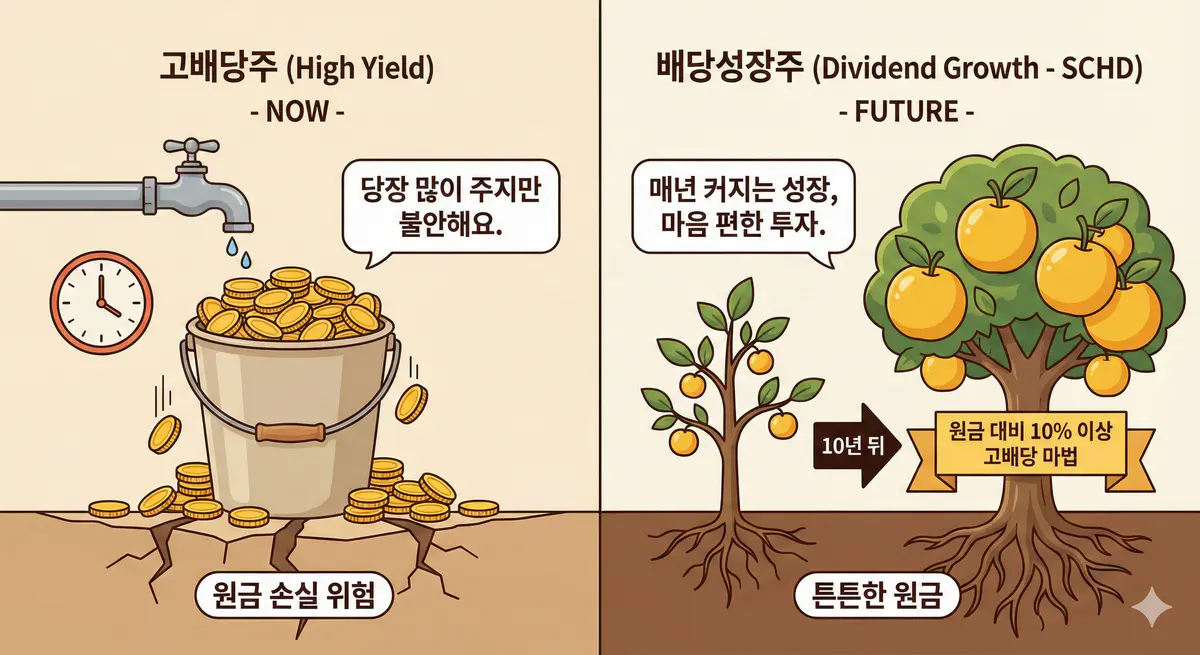 결론부터 말씀드리면, SCHD(미국배당다우존스)는 ‘고배당주’가 아니라 ‘배당성장주’입니다. 이 둘은 족보가 완전히 다릅니다.
