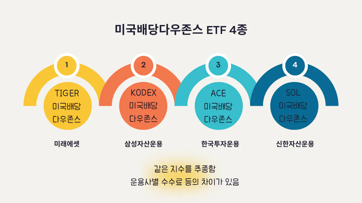 | ETF 명칭 | TIGER 미국배당다우존스 | ACE 미국배당다우존스 | SOL 미국배당다우존스 | KODEX 미국배당다우존스 |