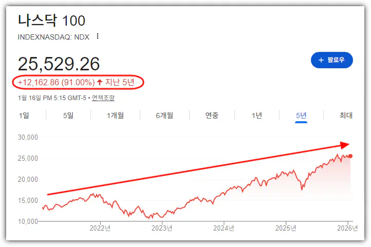 위 그래프를 보시면 5년 전 대비 나스닥100지수는 12,162.86포인트(+91.00%) 상승하며 25,529.26에 도달했습니다.