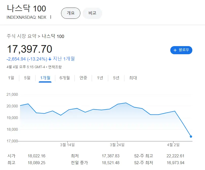 - 기술주 중심 급락: 애플 -9%, 엔비디아 -7%, 테슬라 -10%