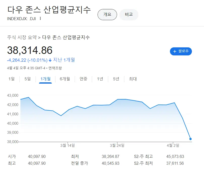 4월 3일, 트럼프 대통령이 57개국에 고율 관세를 선언했고 이틀 만에 나스닥 6%, 다우 4%, S&P500은 12% 가까이 하락했다. 시가총액 4,500조 원이 증발했고, 공포지수 VIX는 29를 넘어섰다.