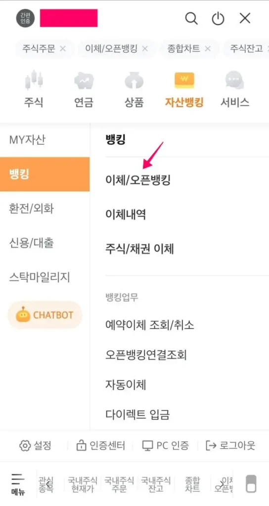 은행 계좌를 연결하는 방법은 아래와 같이 ‘뱅킹’메뉴의 ‘이체/오픈뱅킹’에 들어가세요.