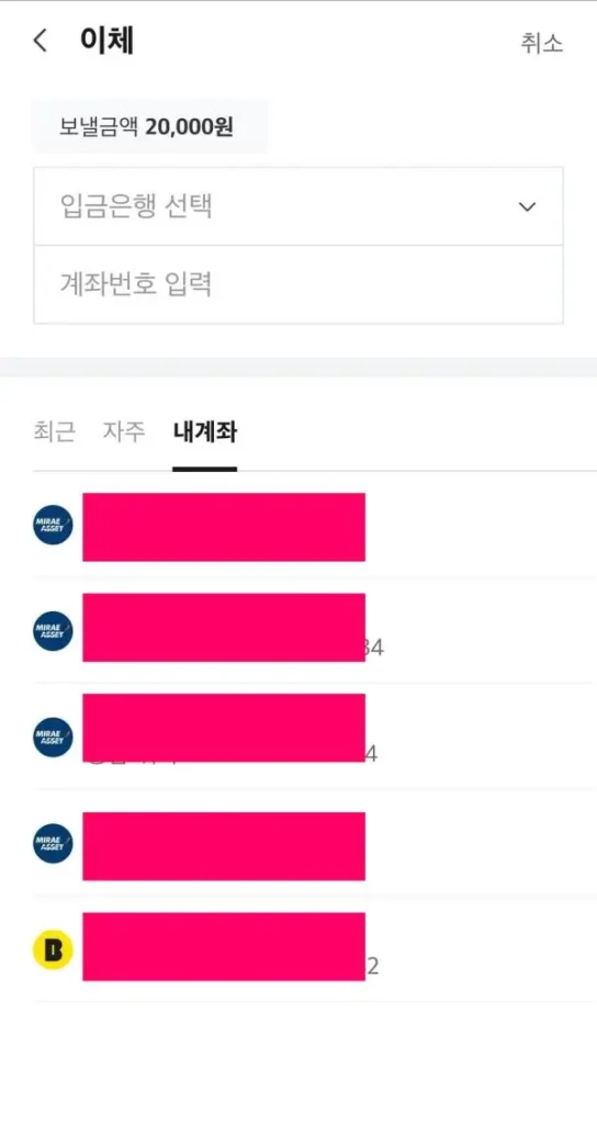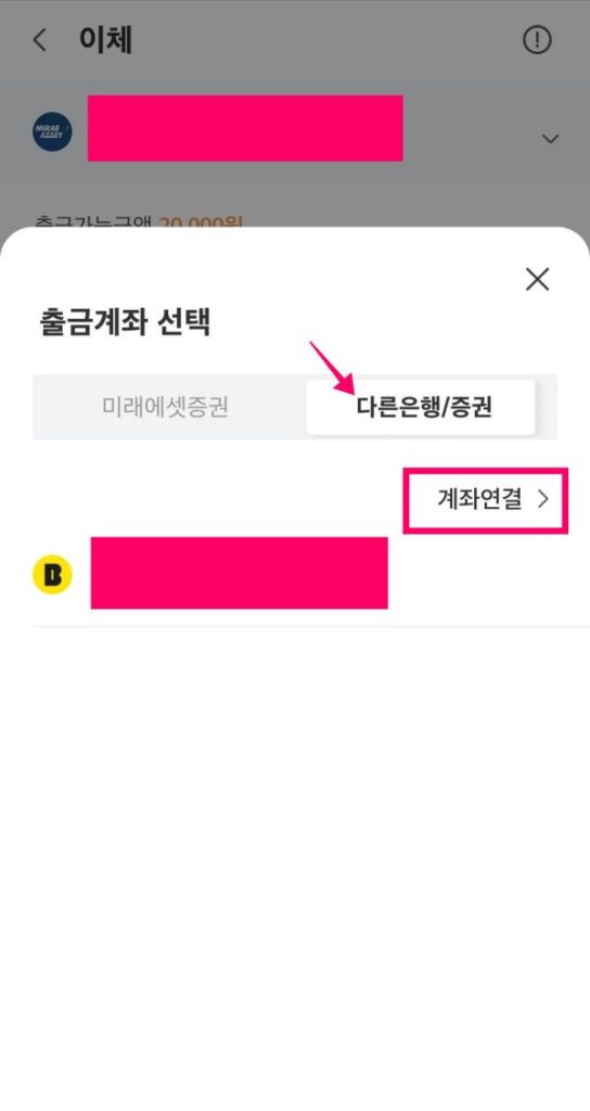 ‘출금계좌 선택’ 메뉴에서 ‘다른은행/증권’에 들어가 ‘계좌연결’을 눌러 은행 계좌를 등록해 놓으면 됩니다. 저는 카카오뱅크 계좌를 연결했습니다.