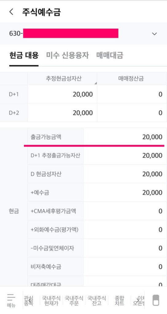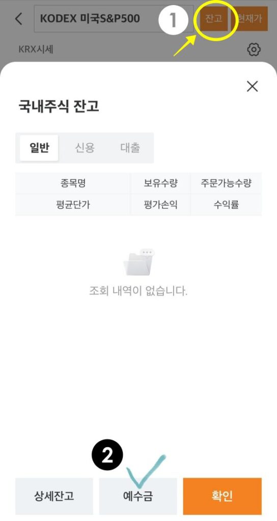 예수금을 확인하려면 ‘잔고’에 들어가 ‘예수금’ 메뉴를 눌러주세요.
