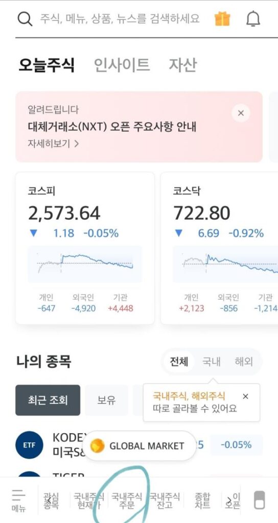 증권계좌에 투자금(예수금)을 이체했다면, 이제 내가 매수하려는 ETF 종목을 검색해야 합니다. 국내 ETF를 사려면 ‘국내주식주문’을 눌러주세요.