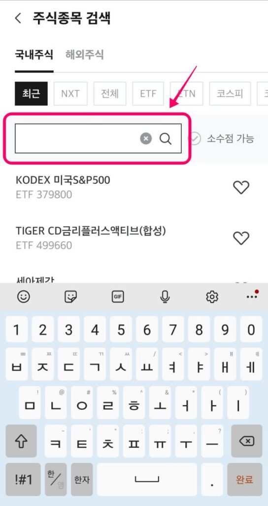 그리고 검색창을 눌러 원하는 종목을 검색하면 되는데요. 국내 상장된 ETF 모두 거래할 수 있습니다. 저는 미국 S&P500 ETF를 사기 위해 ‘KODEX 미국S&P500’을 검색했습니다.