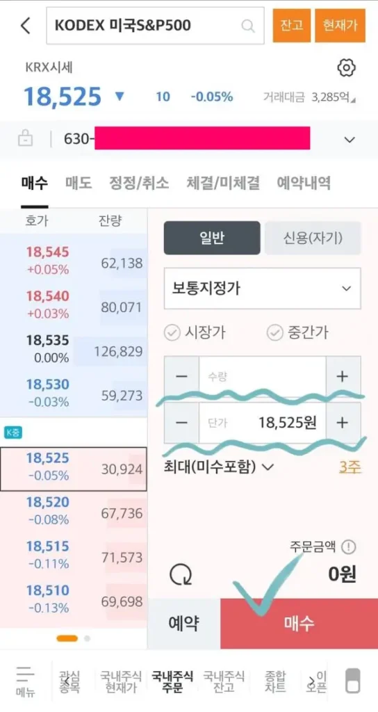 종목 검색을 완료했다면, 수량과 단가를 지정하면 됩니다. 매수하려는 금액을 내가 지정할 수도 있고, ‘시장가’로 매수할 수도 있습니다.