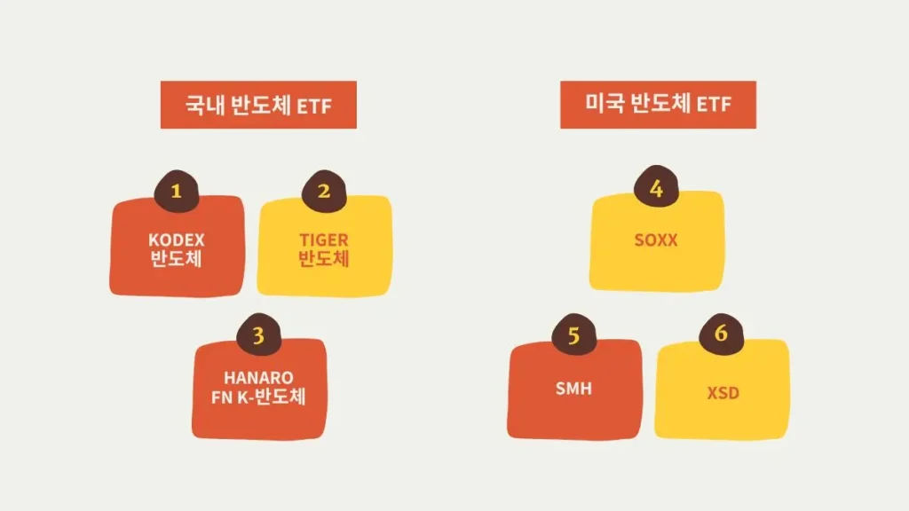 | 대표 ETF | TIGER 반도체 KODEX 반도체 HANARO Fn K-반도체 | SOXX SMH XSD |