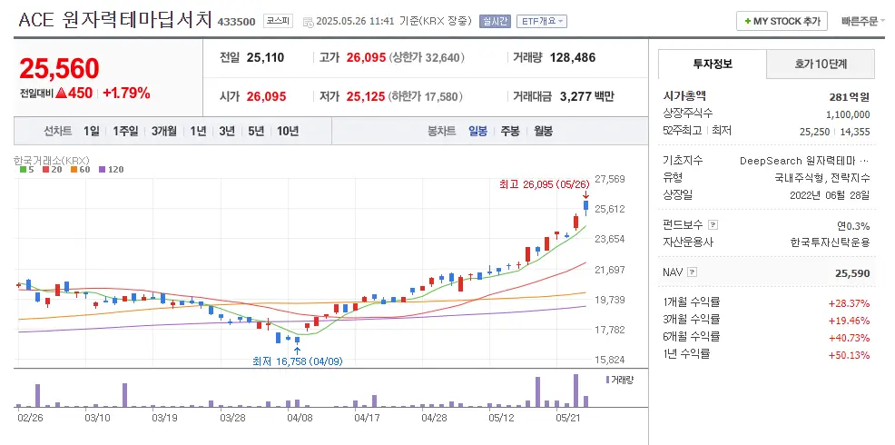 | ACE 원자력테마딥서치 | 원전 설비·건설·운영 기업 (현대건설, 한전기술 등) | +28% (1개월) +50% (1년) | 전략 지수 기반, 테마 표현 정교하지만 운용규모 작음 |