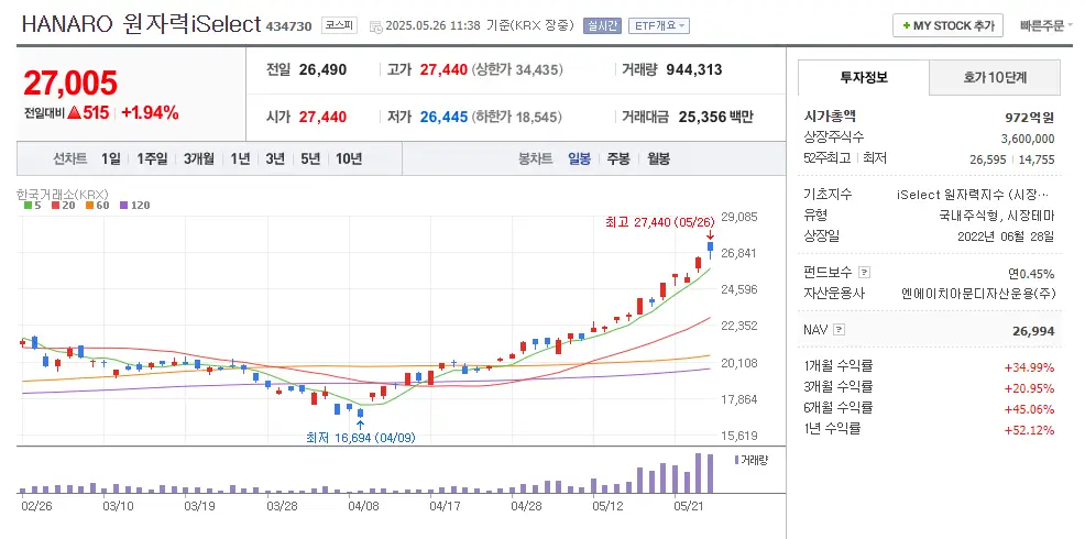 최근 AI 전력 수요 증가, 트럼프 원전 정책 기대감, 국내 대선 공약 이슈까지 겹치며 주목을 받고 있으며, 2025년 5월 기준으로 1개월 수익률은 약 +35%, 1년 수익률은 +52%에 달합니다.