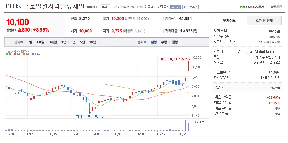 PLUS 글로벌원자력밸류체인은 한화자산운용의 상품으로, 2025년 1월 상장되었습니다. 글로벌 원자력 산업 배류체인 전반(우라늄 채굴부터 SMR 설계까지)에 투자하는 ETF입니다.