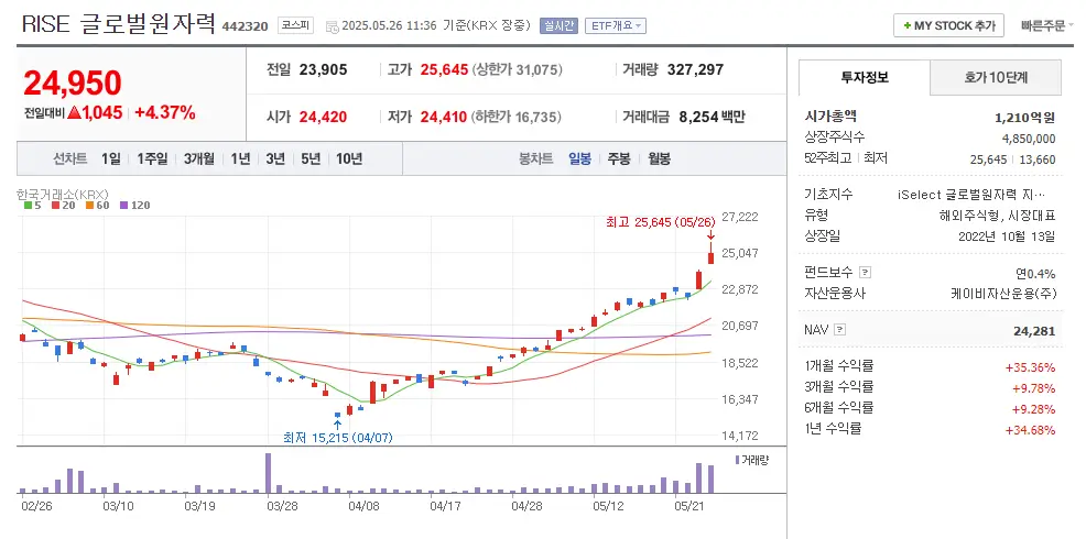 최근 트럼프의 원전 행정명령 기대감과 AI 기반 전력 수요 확대, 대선 원전 공약 이슈 등으로 2025년 5월 기준 1주일간 약 +4.35% 상승했으며, 1년 수익률은 무려 34%에 달합니다.