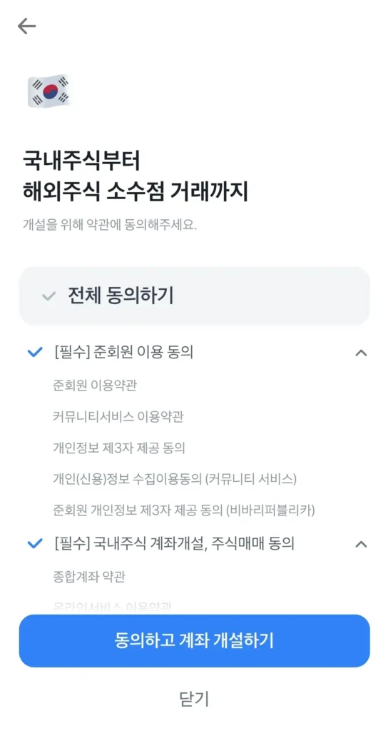 아래와 같이 계좌 개설에 필요한 약관 동의 과정이 진행됩니다. 여기서 ‘전체 동의’를 눌러 주시면 해외 주식 거래까지 함께 신청이 됩니다.