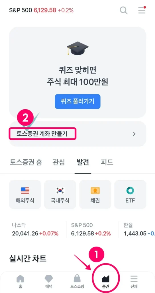 하단에 있는 메뉴 중에서 ‘증권’을 선택한 뒤, ‘토스증권 계좌 만들기’를 눌러 주세요.