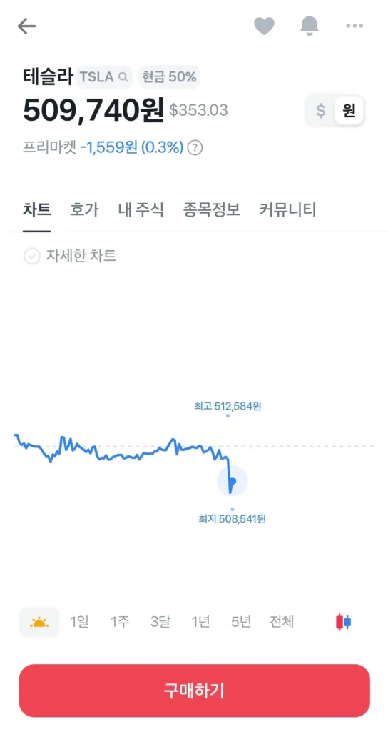 돋보기 메뉴를 이용하여 매수하고 싶은 해외주식을 검색하세요. 저는 테슬라를 검색했습니다. 아래와 같이 현재 주가와 차트, 종목정보, 커뮤니티등이 제공되고 있어요. 달러와 원화가 같이 표시되기 때문에 주식 가격을 쉽게 알아볼 수 있어요. 테슬라는 현재 주당 가격이 $353.03이고, 한화로 50만 9,740원이네요.