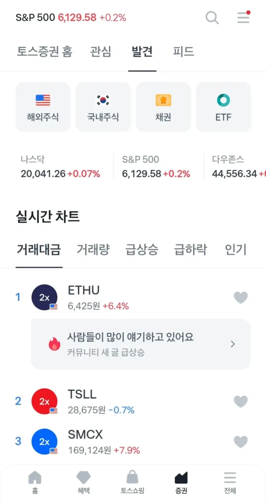 아래와 같이 토스 첫 화면에 들어가 ‘증권’ 메뉴를 클릭합니다. 그럼 여러가지 주식 차트와 주가를 보여줍니다.