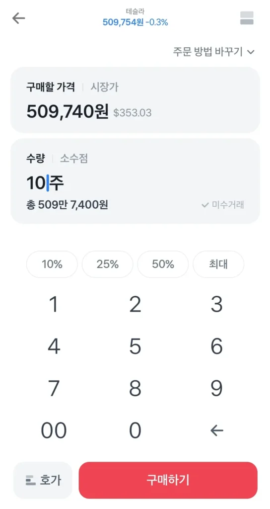다음으로는 구매 수량을 설정하면 됩니다. 이 때, 아까 증권계좌와 연동한 은행 계좌에 충분한 예수금이 있어야 합니다. 그래야 주식을 구매할 수 있어요.