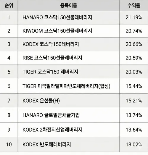 예를 들어, 지난주 코스닥150 레버리지 +20% → 기본 지수는 대략 +9~10% 정도 오른 셈이죠.
