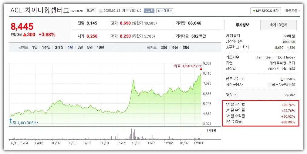 1년 수익률 80%가 넘는 ETF 종목이 있습니다. 주식 투자 좀 한다는 사람들 사이에서 최근 화제가 되고 있는 “ACE 차이나항셍테크” ETF인데요.