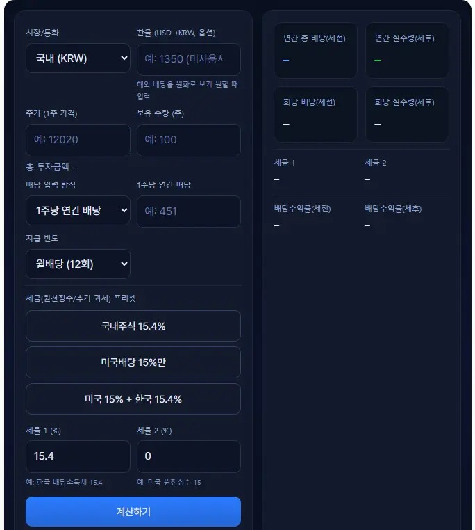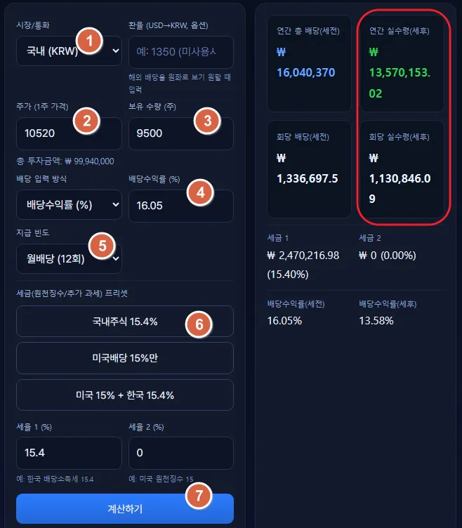 위와 같이 계산을 원하는 주식의 배당 정보를 입력하면 바로 계산됩니다.