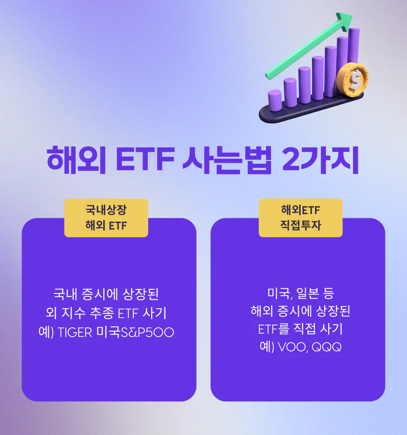 ETF는 국내 상장 ETF와 해외 상장 ETF가 있습니다. 또, 국내 상장 ETF 중에 해외 지수를 추종하는 종목들이 있어요. 만약 해외 ETF에 투자하고 싶다면 직접 해외 상장된 ETF를 사는 방법이 있고, 그게 어렵다면 국내 상장된 ETF 중에서 ‘해외 지수’를 추종하는 ETF를 사면 됩니다.