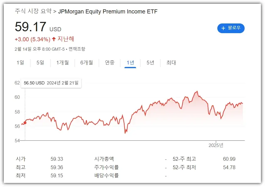 정식 명칭은 JPMorgan Equity Premium Income ETF입니다. 미국 대형주 S&P500 종목에 투자하고 있으며, 커버드콜 전략을 사용하여 주가 변동성이 낮고 안정적인 배당을 하는 종목입니다. 연간 약 6.61%의 배당률을 갖고 있어요.