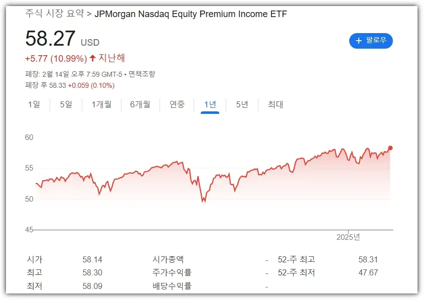 정식 명칭은 JPMorgan Nasdaq Equity Premium Income ETF입니다. 이 종목은 나스닥100 미국 기술주에 투자하는 종목인데요. 기술주를 기반으로 하면서 커버드콜 전략을 사용하여 성장성과 배당을 모두 노리는 종목입니다. 연간 배당률은 약 9.51%입니다.