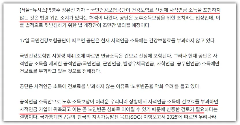건강보험공단도 “노인 빈곤율이 너무 높아서 사적연금에 건보료까지 매기면 가입이 위축된다”는 이유로 제외해왔습니다. 근데 법제실에서 “이거 사실상 법 위반이다”라고 못을 박으면서 다시 이슈화되고 있습니다.