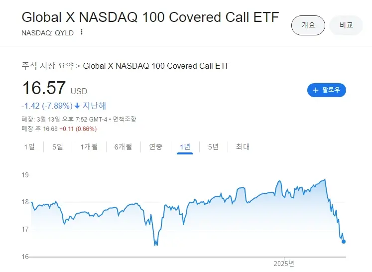 배당이 매력적인 이유는 꾸준한 현금 흐름을 제공하기 때문입니다. 하지만 QYLD의 배당은 콜옵션 프리미엄 수익에 의존하기 때문에, 나스닥 변동성이 줄어들면 프리미엄 수익이 감소하고 배당금도 줄어들 수 있습니다.