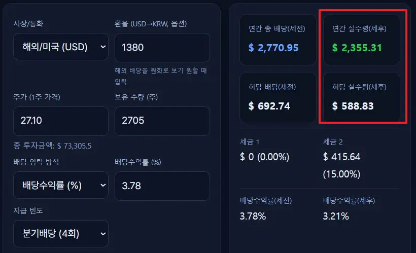 미국 주식 배당금은 배당소득세 15%가 원천징수되므로, 실수령액은 다음과 같이 계산됩니다.