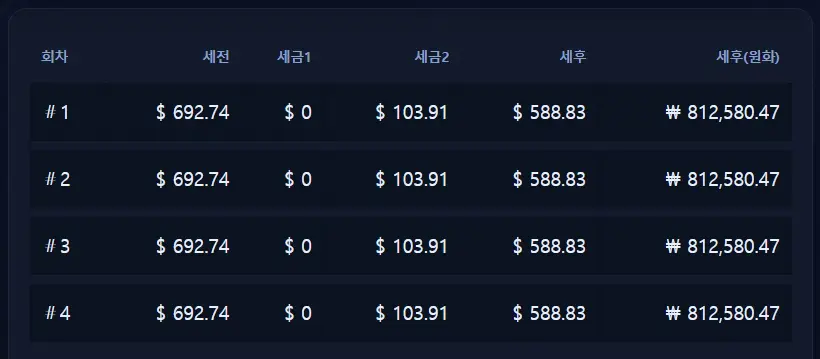 참고로, 아래와 같이 원화로 얼마인지도 계산됩니다. 분기 배당금 약 81만 원 정도 받을 수 있네요.