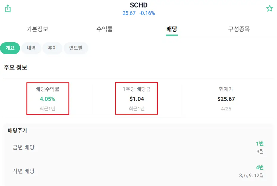 SCHD는 분기별로 3, 6, 9, 12월 총 4번 배당금을 지급하며, 최근 배당률은 4.05% 수준입니다. 현재 1주당 배당금은 $1.04이지만, 매년 변동될 수 있기 때문에 투자를 하면서 ‘최신 배당 정보’를 체크하는 것이 좋습니다.