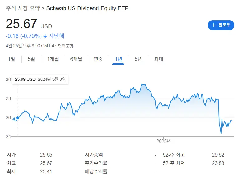 위 내용은 제가 4월에 작성하였으나, 2025년 8월 현재 SCHD의 주가 및 배당수익률이 달라졌습니다.