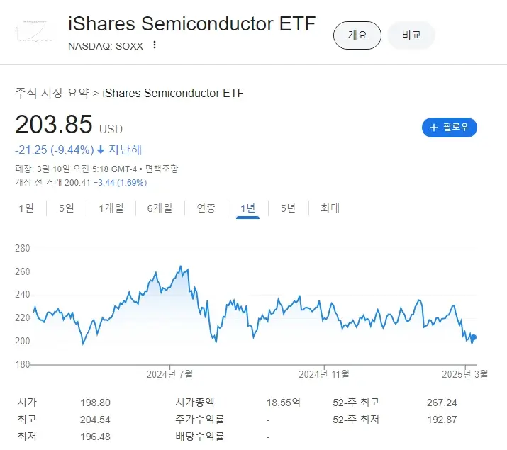 최근 1년간 SOXX 주가 흐름을 보면, 52주 최고가는 267.24 USD, 52주 최저가 192.87USD로 1년 전과 비교했을 때 9.44% 하락했습니다. 현재 주가는 203.85 USD입니다.