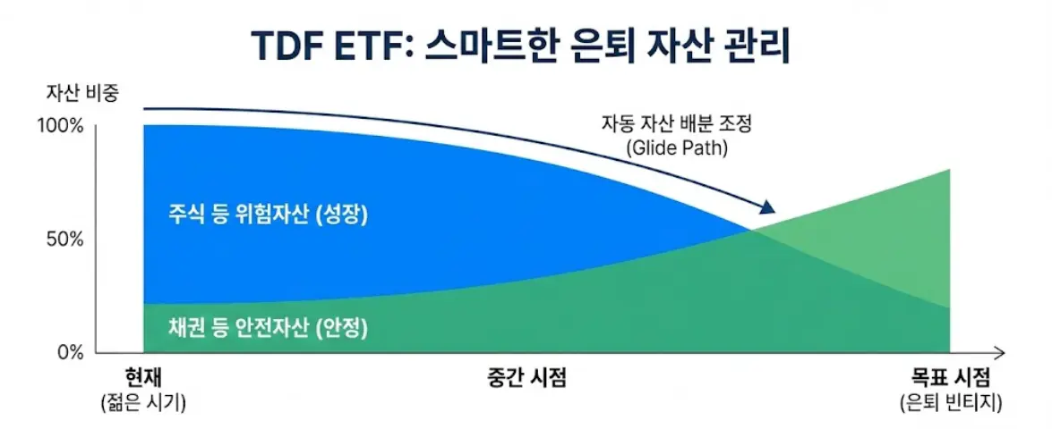TDF ETF는 타깃데이트펀드(TDF)를 상장지수펀드(ETF) 형태로 만든 상품입니다. TDF는 투자자가 설정한 목표 시점(빈티지)에 맞춰 자산 비중을 자동으로 조정하는 펀드인데요.