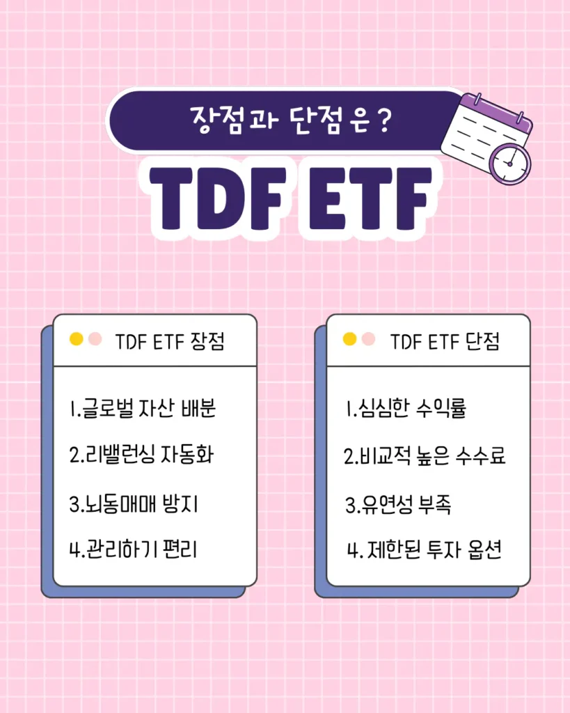 TDF ETF는 특정 목표 시점(예: 2030, 2040, 2050)에 맞춰 자산 배분이 자동으로 조정되기 때문에, 개별 투자자의 위험 성향이나 시장 상황에 따라 유연하게 대응하기 어려울 수 있습니다.