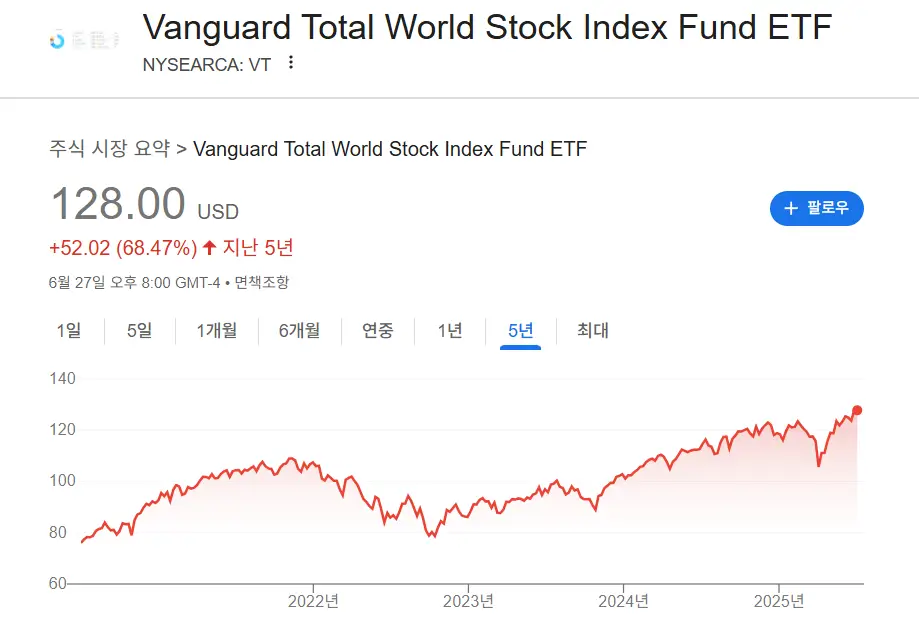 미국에는 이미 전 세계 주식에 분산 투자하는 대표 ETF인 VT(Vanguard Total World Stock ETF)가 존재합니다. VT는 현재 순자산이 62조 원을 넘으며, ‘전 세계 주식에 올인’하는 투자자들의 필수템으로 불리고 있죠.