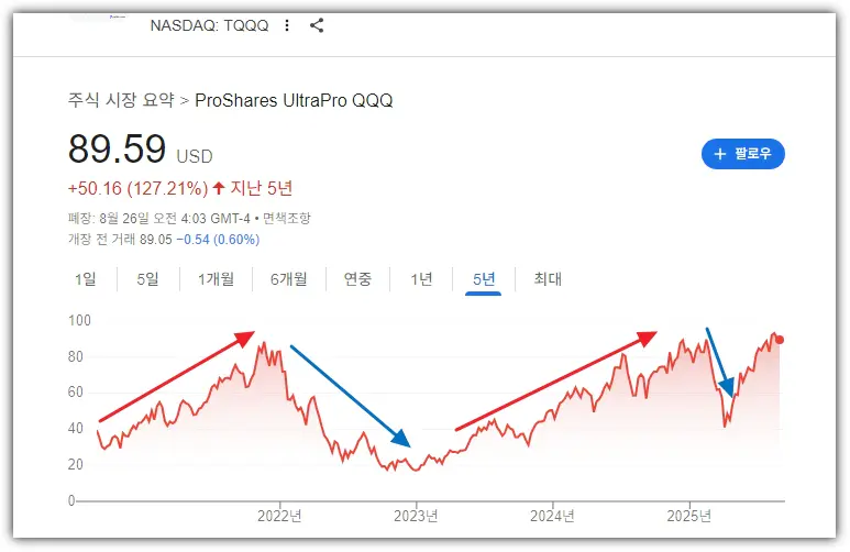 저는 지금도 TQQQ를 소액 들고 있습니다. 다만 예전처럼 “이걸로 은퇴하겠다”라는 꿈은 버렸습니다.