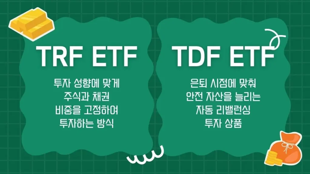TDF ETF와 TRF ETF는 모두 은퇴 준비용 자산배분 ETF라는 점에서는 유사하지만, 설정 방식과 리밸런싱 로직, 투자자의 접근 방식에서 차이가 있습니다.