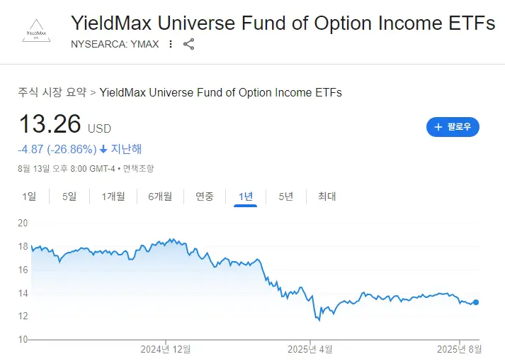 즉, YMAX는 주가 상승을 일부 포기하는 대신 옵션 프리미엄을 배당 형태로 지급합니다.
