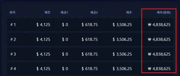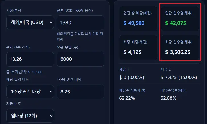 배당금을 직접 계산해 보니 1억을 투자했을 때, 연간 세후 배당금이 $42,075입니다.